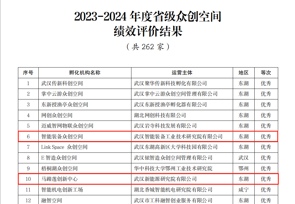 日前,湖北省科技廳關于2023-2024年度省級以上科技企業(yè)孵化器和眾創(chuàng)空間績效評價結果結束公示期,湖北科投運營的3個國家級、省級眾創(chuàng)空間獲評“優(yōu)秀”,6個國家級科技企業(yè)孵化器、國家專業(yè)化眾創(chuàng)空間獲評“良好”。